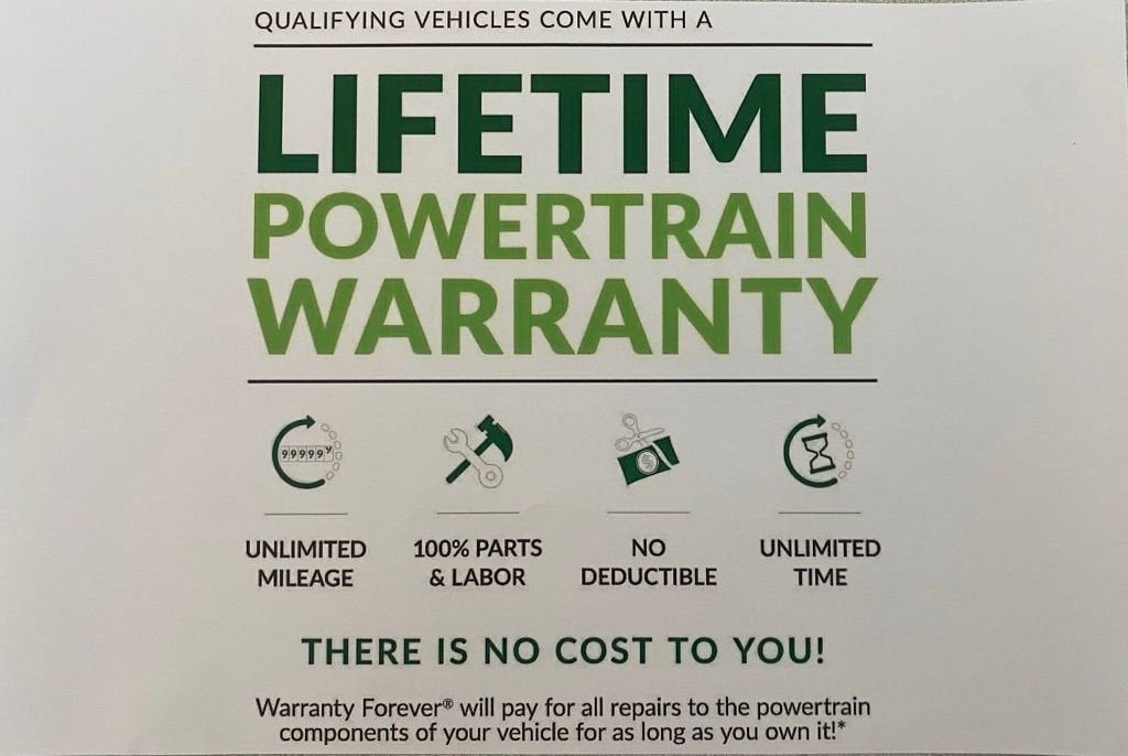 This vehicle comes with a Lifetime Powertrain Warranty at no additional cost to you!